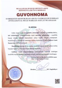 20 | №009306 | Metodlar jamlanmasi – "LEARNING ANALYTICS, KAIZEN, GAMIFIKATSIYA, 360° ASSESSMENT, (E-PORTFOLIO)" | Gaffarov Laziz Xasanovich (100%) | Gaffarov Laziz Xasanovich | 10/09/2025 | ![]() |