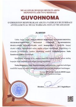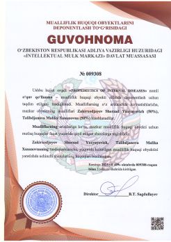 18 | №009308 | O‘quv qo‘llanma – "PROPEDEUTICS OF INTERNAL DISEASES" | Zakirxodjayev Sherzad Yaxyayevich (50%), Talibdjanova Malika Xusanovna (50%) | Zakirxodjayev Sherzad Yaxyayevich, Talibdjanova Malika Xusanovna | 10/09/2025 | ![]() |