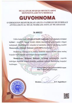 2 | №009324 | Ilmiy ishlanma –"ХИРУРГИЧЕСКАЯ МЕТОДИКА ЗАКРЫТИЯ ВРАЖДЕННОГО ИЛИ ПРИОБРЕТЕННОГО ДЕФЕКТА СОШНИКА (VOMER) КОНВЕРТНЫМ ЛОСКУТОМ" | Kazimov Alibek Baxtiyorovich (100%) | Kazimov Alibek Baxtiyorovich | 10/10/2025 | ![]() |