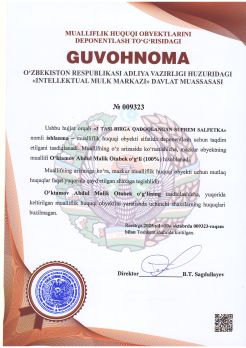 1 | №009325 | Hosila asar – "USTI QIYMALI QOVOQ SOMSA" | Asqarov Saidjaloliddin Xotam o‘g‘li (100%) | Asqarov Saidjaloliddin Xotam o‘g‘li | 10/10/2025 | ![]() |