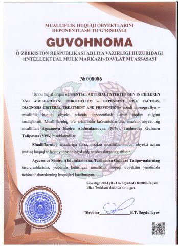 | 2000 | №008086 | Monografiya - "ESSENTIAL ARTERIAL HYPERTENSION IN CHILDREN AND ADOLESCENTS: ENDOTHELIUM – DEPENDENT RISK FACTORS, DIAGNOSIS CRITERIA, TREATMENT AND PREVENTION" | Agzamova Shoira Abdusalamovna (50%), Tashenova Gulnara Talipovna (50%) | Agzamova Shoira Abdusalamovna, Tashenova Gulnara Talipovna | 11/11/2024 | ![]() |