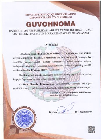 | 1999 | №008087 | Monografiya - "HUDUDLARDA MAISHIY XIZMAT KO’RSATISH SOHASI RIVOJLANISHINING TASHKILIY-IQTISODIY MEXANIZMI" | Artikova Shoxida Ilyasovna (100%) | Artikova Shoxida Ilyasovna | 11/11/2024 | ![]() |