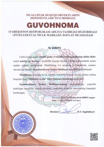| 1995 | №008091 | Uslubiy qo‘llanma – "Xotin-qizlar o‘rtasida boqimandalikning oldini olish" | Egamberdiyeva Nodira Melibayevna (100%) | “Mahalla va oila” ilmiy-tadqiqot instituti | 11/12/2024 | ![]() |