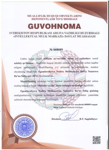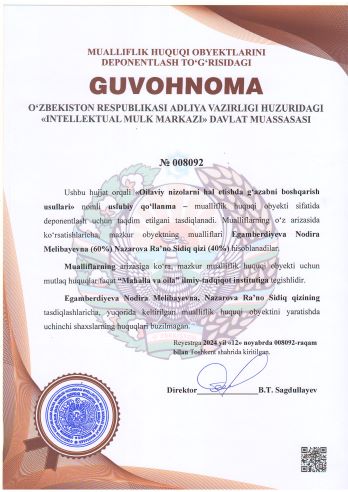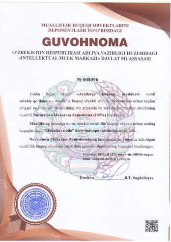 | 1994 | №008092 | Uslubiy qo‘llanma – "Oilaviy nizolarni hal etishda g‘azabni boshqarish usullari" | Egamberdiyeva Nodira Melibayevna (60%) Nazarova Ra’no Sidiq qizi (40%) | “Mahalla va oila” ilmiy-tadqiqot instituti | 11/12/2024 | ![]() |