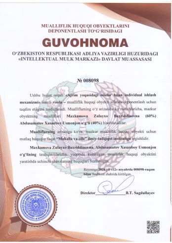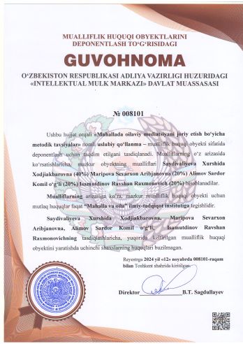 | 1988 | №008098 | Risola – "Ajrim yoqasidagi oilalar bilan individual ishlash mexanizmi" | Maxkamova Zulayxo Baxriddinovna (60%) Abdusamatov Xasanboy Usmonjon o‘g‘li (40%) | “Mahalla va oila” ilmiy-tadqiqot instituti | 11/12/2024 | ![]() |