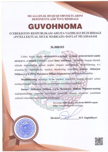 | 1983 | №008103 | Ilmiy ishlanma – "КОНЦЕПТУАЛЬНЫЕ ЭТАПЫ ИМПЛЕМЕНТАЦИИ ПРОЕКТА «УМНЫЙ ГОРОД»" | Iminov Akbarjon Odiljon o‘g‘li (55%) Raximova Dilfuza Nigmatovna (45%) | Iminov Akbarjon Odiljon o‘g‘li, Raximova Dilfuza Nigmatovna | 11/12/2024 | ![]() |