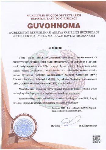 | 2075 | №008030 | Ilmiy maqola – "СОВЕРШЕНСТВОВАНИЕ ЭФФЕКТИВНОСТИ ВИДЕОТОРАКОСКОПИИ ПРИ ЭХИНОКОККЭКТОМИЙ ЛЕГКОГО У ДЕТЕЙ" | Xudaynazarov Xayrulla Xamitovich (25%), Usmanov Xojiakbar Sabirovich (25%), Fayzullayev Tojiddin Sulaymanovich (25%), Ochilov Rustam Ochilovich (25%) | Xudaynazarov Xayrulla Xamitovich, Usmanov Xojiakbar Sabirovich, Fayzullayev Tojiddin Sulaymanovich, Ochilov Rustam Ochilovich | 10/21/2024 | ![]() |