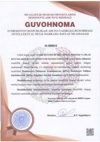 | 2073 | №008032 | Ilmiy ishlanma – "YOSH DZYUDOCHI QIZLARNING BARMOQ VA BILAK BO‘G‘INLARINI RIVOJLANTIRUVCHI MAXSUS TRENAJOR" | Dadaboyeva Odinaxon Arabdjanovna (60%), Dadabayev Odiljon Jalolidinovich (20%), Ergashev Javohir Xusanboy o‘g‘li (20%) | Dadaboyeva Odinaxon Arabdjanovna, Dadabayev Odiljon Jalolidinovich, Ergashev Javohir Xusanboy o‘g‘li | 10/21/2024 | ![]() |