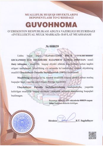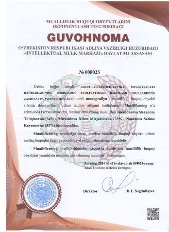 | 2076 | №008029 | Darslik – "METHODOLOGY OF SCIENTIFIC RESEARCH (EVIDENCE-BASED MEDICINE)" | Mamatkulov Baxramjon (25%), Urazaliyeva Ilmira Ravkatovna (25%), Umurzakova Dilorom Abdumuminovna (25%), Tolipova Gulxayoxon Komiljon qizi (25%) | Mamatkulov Baxramjon, Urazaliyeva Ilmira Ravkatovna, Umurzakova Dilorom Abdumuminovna, Tolipova Gulxayoxon Komiljon qizi | 10/21/2024 | ![]() |
