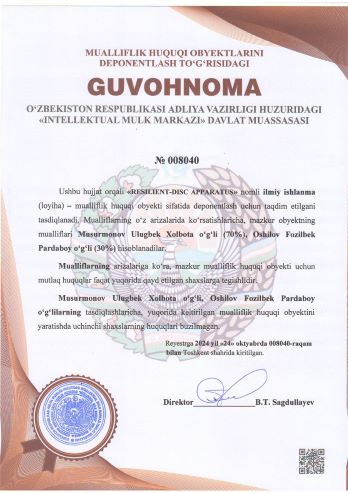 | 2065 | №008040 | Ilmiy ishlanma (loyiha) – "RESILIENT-DISC APPARATUS" | Musurmonov Ulugbek Xolbo'ta o‘g‘li (70%), Ochilov Fozilbek Pardaboy o‘g‘li (30%) | Musurmonov Ulugbek Xolbo'ta o‘g‘li, Ochilov Fozilbek Pardaboy o‘g‘li | 10/24/2024 | ![]() |