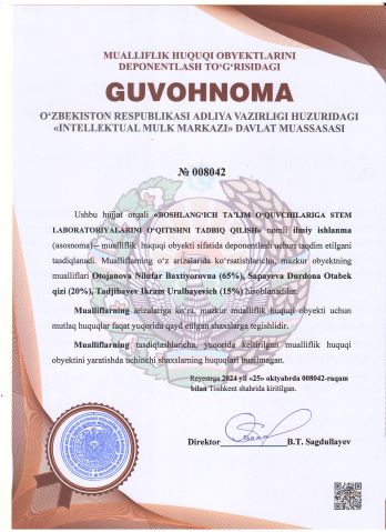 | 2063 | №008042 | Ilmiy ishlanma – "BOSHLANG‘ICH TA’LIM O‘QUVCHILARIGA STEM LABORATORIYALARINI O‘QITISHNI TADBIQ QILISH" | Otojanova Nilufar Baxtiyorovna (65%), Sapayeva Durdona Otabek qizi (20%), Tadjibayev Ikram Uralbayevich (15%) | Otojanova Nilufar Baxtiyorovna, Sapayeva Durdona Otabek qizi, Tadjibayev Ikram Uralbayevich | 10/25/2024 | ![]() |