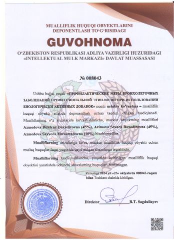 | 2062 | №008043 | Uslubiy ko‘rsatma – "ПРОФИЛАКТИЧЕСКИЕ МЕРЫ БРОНХОЛЕГОЧНЫХ ЗАБОЛЕВАНИЙ ПРОФЕССИОНАЛЬНОЙ ЭТИОЛОГИИ ПРИ ИСПОЛЬЗОВАНИИ БИОЛОГИЧЕСКИ АКТИВНЫХ ДОБАВОК" | Axmedova Dilafruz Baxadirovna (45%), Azimova Sevara Baxodirovna (45%), Axmedova Sayyora Muxamadovna (10%) | Axmedova Dilafruz Baxadirovna, Azimova Sevara Baxodirovna, Axmedova Sayyora Muxamadovna | 10/25/2024 | ![]() |