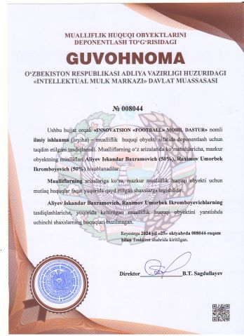 | 2061 | №008044 | Ilmiy ishlanma (loyiha) – "INNOVATSION «FOOTBALL» MOBIL DASTUR" | Aliyev Iskandar Baxramovich (50%), Raximov Umorbek Ikromboyevich (50%) | Aliyev Iskandar Baxramovich, Raximov Umorbek Ikromboyevich | 10/25/2024 | ![]() |
