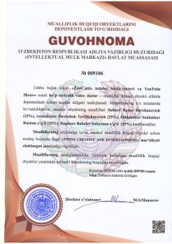 219 | №009106 | Ko‘p seriyalik video dastur – "«ZooCast» bolalar teleko‘rsatuvi va YouTube Shou" | Salixov Xasan Ravshanovich (25%), Arabshoyev Davlatbek Tavfikshoyevich (25%), Saidazimov Saidakbar Rustam o‘g‘li (25%), Ragimov Babalar Suleyman o‘g‘li (25%) | «TWINS CREATIVE AND ENTERTAINMENT» mas’uliyati cheklangan jamiyati | 16.07.2025 | ![]() |