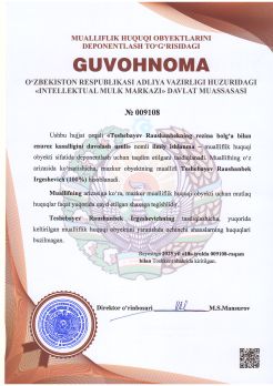 202 | №009123 | Ilmiy ishlanma – "G‘O‘ZA TOLASINING GIGROSKOPIKLIGI YUQORI BO‘LGAN T-0306 TIZMASI" | Xalikova Maloxat Babamuradovna (40%), Axmedov Otabek Abdashimovich (40%), Matyaqubova Elmira Umrbekovna (10%), Sharipov Shuhrat Tulkinovich (5%), Rahmonova Ruxsora Baxriddinovna (5%) | Xalikova Maloxat Babamuradovna (40%), Axmedov Otabek Abdashimovich, Matyaqubova Elmira Umrbekovna, Sharipov Shuhrat Tulkinovich, Rahmonova Ruxsora Baxriddinovna | 24.07.2025 | ![]() |