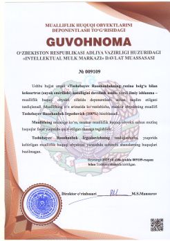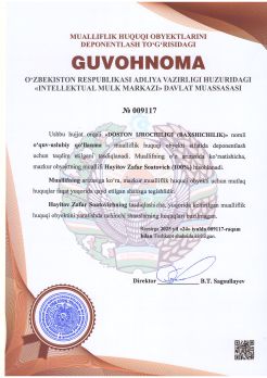 208 | №009117 | O‘quv-uslubiy qo‘llanma – "DOSTON IJROCHILIGI (BAXSHICHILIK)" | Hayitov Zafar Soatovich (100%) | Hayitov Zafar Soatovich | 24.07.2025 | ![]() |