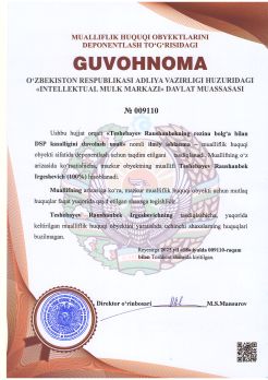 201 | №009124 | Ilmiy ishlanma – "G‘O‘ZANING TOLA CHIQIMI VA GIGROSKOPIKLIGI YUQORI BO‘LGAN T-1980 TIZMASI" | Xalikova Maloxat Babamuradovna (40%), Axmedov Otabek Abdashimovich (40%), Matyaqubova Elmira Umrbekovna (10%), Soriyeva Sayyora Erkinovna (5%), Rahmonova Ruxsora Baxriddinovna (5%) | Xalikova Maloxat Babamuradovna (40%), Axmedov Otabek Abdashimovich, Matyaqubova Elmira Umrbekovna, Soriyeva Sayyora Erkinovna, Rahmonova Ruxsora Baxriddinovna | 24.07.2025 | ![]() |