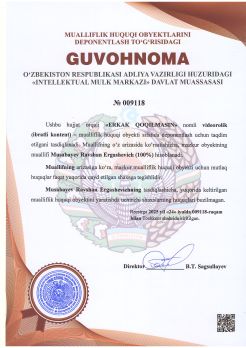 213 | №009112 | Davomiyligi 3100 daqiqalik serial ssenariysi – "UKA" | Usanboyeva Nargiza Turdibekovna (100%) | «HYPER FILMS» masʼuliyati cheklangan jamiyati | 18.07.2025 | ![]() |