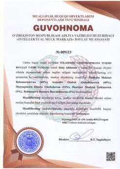 205 | №009120 | O‘quv qo‘llanma – "AN’ANAVIY DO‘MBIRA" | Hayitov Zafar Soatovich (50%), Safarov Bekzod Normurodovich (50%) | Hayitov Zafar Soatovich, Safarov Bekzod Normurodovich | 24.07.2025 | ![]() |