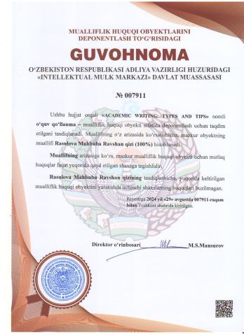 | 2193 | №007911 | O‘quv qo‘llanma – "ACADEMIC WRITING: TYPES AND TIPS" | Rasulova Mahbuba Ravshan qizi | Rasulova Mahbuba Ravshan qizi | 08/29/2024 | ![]() |