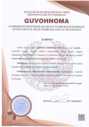 | 2191 | №007913 | Darslik – "КОРПОРАТИВНАЯ КУЛЬТУРА" | Umarxodjayeva Muyassarxon Ganiyevna (100%) | Umarxodjayeva Muyassarxon Ganiyevna | 09/06/2024 | ![]() |