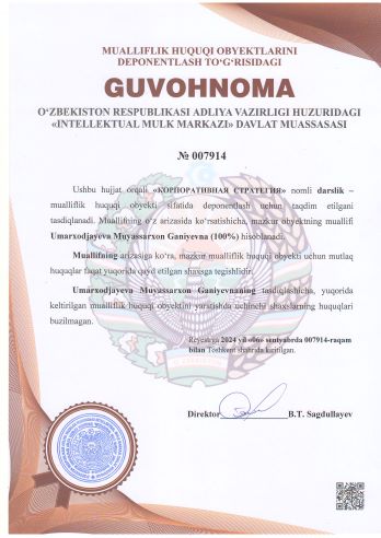 | 2190 | №007914 | Darslik – "КОРПОРАТИВНАЯ СТРАТЕГИЯ" | Umarxodjayeva Muyassarxon Ganiyevna (100%) | Umarxodjayeva Muyassarxon Ganiyevna | 09/06/2024 | ![]() |