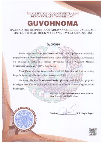 | 2199 | №007905 | Darslik – "PORTFEL MENEJMENTI" | Shamansurova Zilola Abduvaxitovna (100%) | Shamansurova Zilola Abduvaxitovna | 08/29/2024 | ![]() |