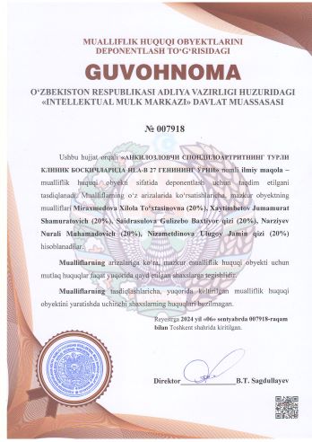| 2187 | №007918 | Ilmiy ishlanma - "АНКИЛОЗЛОВЧИ СПОНДИЛОАРТРИТНИНГ ТУРЛИ КЛИНИК БОСҚИЧЛАРИДА HLA-B 27 ГЕНИНИНГ ЎРНИ" | Miraxmedova Xilola To‘xtasinovna (20%), Xaytimbetov Jumamurat Shamuratovich (20%), Saidrasulova Gulizebo Baxtiyor qizi (20%), Narziyev Nurali Muhamadovich (20%), Nizametdinova Ulugoy Jamin qizi (20%) | Miraxmedova Xilola To‘xtasinovna (20%), Xaytimbetov Jumamurat Shamuratovich, Saidrasulova Gulizebo Baxtiyor qizi, Narziyev Nurali Muhamadovich, Nizametdinova Ulugoy Jamin qizi | 09/06/2024 | ![]() |