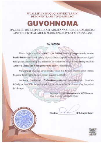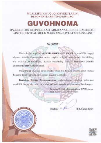 | 2184 | №007921 | Darslik – "РУССКИЙ ЯЗЫК" | Kamalova Malika Nizamovna (100%) | Kamalova Malika Nizamovna | 09/06/2024 | ![]() |