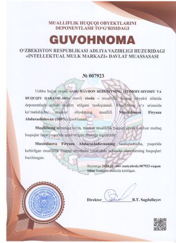 | 2182 | №007923 | Risola – "ABU RAYHON BERUNIYNING IJTIMOIY-SIYOSIY VA HUQUQIY QARASHLARI" | Muxitdinova Firyuza Abdurashidovna (100%) | Muxitdinova Firyuza Abdurashidovna | 09/06/2024 | ![]() |