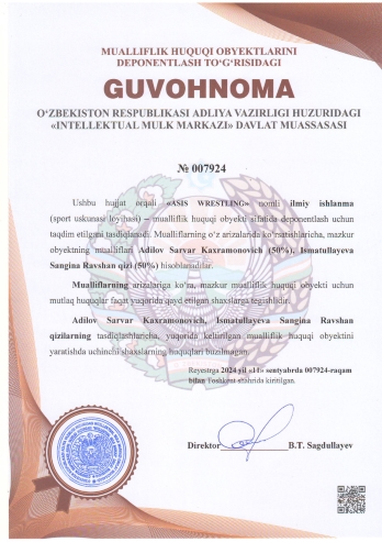 | 2181 | №007924 | Ilmiy ishlanma (sport uskunasi loyihasi) – "ASIS WRESTLING" | Adilov Sarvar Kaxramonovich (50%), Ismatullayeva Sangina Ravshan qizi (50%) | Adilov Sarvar Kaxramonovich, Ismatullayeva Sangina Ravshan qizi | 09/11/2024 | ![]() |