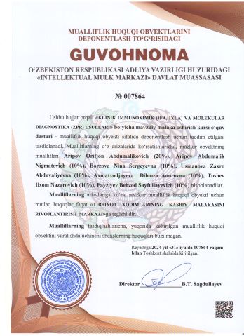 | 2240 | №007864 | "KLINIK IMMUNOXIMIK (IFA, IXLA) VA MOLEKULAR DIAGNOSTIKA (ZPR) USULLARI" bo‘yicha mavzuiy malaka oshirish kursi o‘quv dasturi | Aripov Orifjon Abdumalikovich (20%), Aripov Abdumalik Nigmatovich (10%), Borzova Nina Sergeyevna (10%), Usmanova Zaxro Abduvaliyevna (10%), Axmatxodjayeva Dilnoza Anorovna (10%), Toshev Ilxom Nazarovich (10%), Fayziyev Behzod Sayfullayevich (10%) | "TIBBIYOT XODIMLARINING KASBIY MALAKASINI RIVOJLANTIRISH MARKAZI" | 07/31/2024 | ![]() |