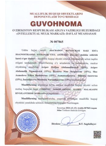 | 2239 | №007865 | "BACHADON BO‘YINCHASI RAKI ERTA DIAGNOSTIKASIDA SITOLOGIK USUL ASOSLARI" mavzuiy malaka oshirish kursi o‘quv dasturi | Aripov Orifjon Abdumalikovich (25%), Aripov Abdumalik Nigmatovich (15%), Borzova Nina Sergeyevna (15%), Sha-Axmedova Liliya Rashidovna (15%), Axmatxodjayeva Dilnoza Anorovna (15%), Isaxodjayeva Maxbuba Nurxudjayevna (15%) | "TIBBIYOT XODIMLARINING KASBIY MALAKASINI RIVOJLANTIRISH MARKAZI" | 07/31/2024 | ![]() |