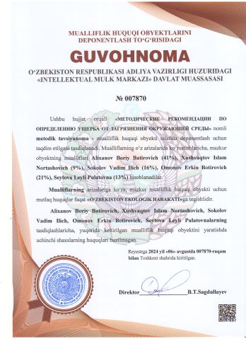 | 2235 | №007869 | Metodik qo‘llanma - "МЕТОДИЧЕСКИЕ РЕКОМЕНДАЦИИ ПО ОПРЕДЕЛЕНИЮ УЩЕРБА ОТ ЗАГРЯЗНЕНИЯ ЗЕМЕЛЬI" | Alixanov Boriy Batirovich (51%), Sokolov Vadim Ilich (37%), Seytova Leyli Pulatovna (12%) | OʻZBEKISTON EKOLOGIK HARAKATI | 08/06/2024 | ![]() |