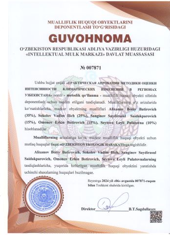 | 2233 | №007871 | Metodik qo‘llanma - "ПРАКТИЧЕСКАЯ АПРОБАЦИЯ МЕТОДИКИ ОЦЕНКИ ИНТЕНСИВНОСТИ КЛИМАТИЧЕСКИХ ИЗМЕНЕНИЙ В РЕГИОНАХ УЗБЕКИСТАНА" | Alixanov Boriy Batirovich (35%), Sokolov Vadim Ilich (25%), Sanginov Saydirasul Saidakparovich (15%), Omonov Erkin Botirovich (15%), Seytova Leyli Pulatovna (10%) | OʻZBEKISTON EKOLOGIK HARAKATI | 08/06/2024 | ![]() |