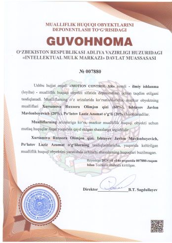 | 2224 | №007880 | Ilmiy ishlanma (loyiha) - "MOTION CONTROL XR" | Xursanova Ruxsora Olimjon qizi (60%), Ishtayev Javlon Mavlonboyevich (20%), Po‘latov Laziz Azamat o‘g‘li (20%) | Xursanova Ruxsora Olimjon qizi, Ishtayev Javlon Mavlonboyevich, Po‘latov Laziz Azamat o‘g‘li | 08/14/2024 | ![]() |