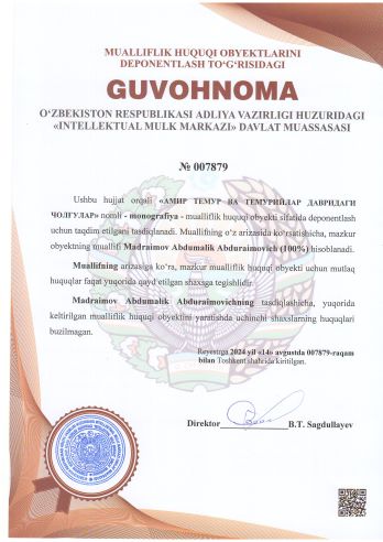 | 2225 | №007879 | Monografiya - "АМИР ТЕМУР ВА ТЕМУРИЙЛАР ДАВРИДАГИ ЧОЛҒУЛАР" | Madraimov Abdumalik Abduraimovich (100%) | Madraimov Abdumalik Abduraimovich | 08/14/2024 | ![]() |