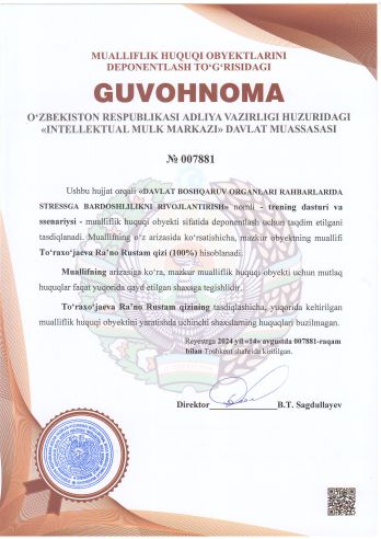 | 2223 | №007881 | Trening dasturi va ssenariysi - "DAVLAT BOSHQARUV ORGANLARI RAHBARLARIDA STRESSGA BARDOSHLILIKNI RIVOJLANTIRISH" | To‘raxo‘jaeva Ra’no Rustam qizi (100%) | To‘raxo‘jaeva Ra’no Rustam qizining | 08/14/2024 | ![]() |