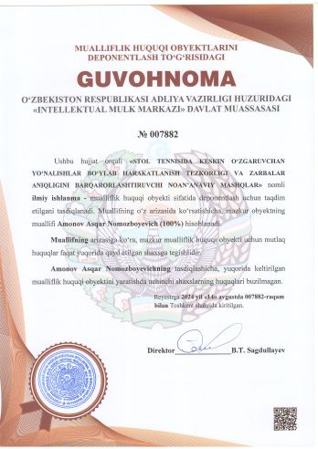 | 2222 | №007882 | Ilmiy ishlanma - "STOL TENNISIDA KESKIN OʻZGARUVCHAN YOʻNALISHLAR BOʻYLAB HARAKATLANISH TEZKORLIGI VA ZARBALAR ANIQLIGINI BARQARORLASHTIRUVCHI NOANʼANAVIY MASHQLAR" | Amonov Asqar Nomozboyevich (100%) | Amonov Asqar Nomozboyevich | 08/14/2024 | ![]() |