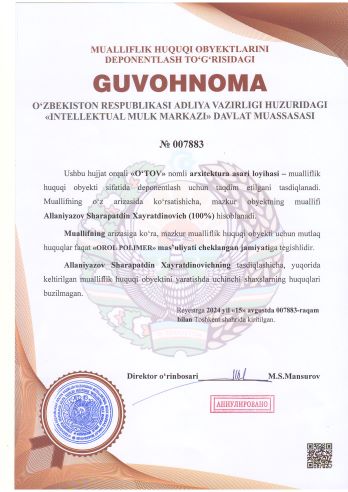 | 2221 | №007883 | Аrxitektura asari loyihasi - "O‘TOV" | Allaniyazov Sharapatdin Xayratdinovich (100%) | "OROL POLIMER" mas’uliyati cheklangan jamiyati | 08/15/2024 | ![]() |