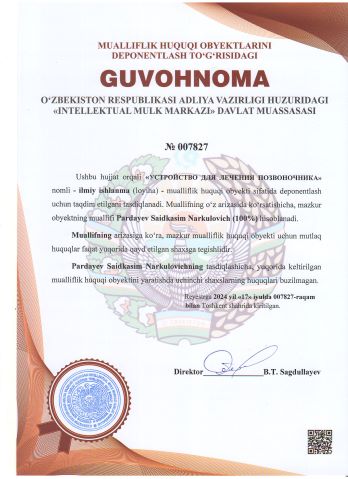 | 2277 | №007827 | Ilmiy ishlanma (loyiha) - "УСТРОЙСТВО ДЛЯ ЛЕЧЕНИЯ ПОЗВОНОЧНИКА" | Pardayev Saidkasim Narkulovich (100%) | Pardayev Saidkasim Narkulovich | 07/17/2024 | ![]() |