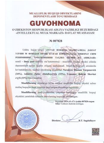 | 2276 | №007828 | Ilmiy asar (tahliliy maʼlumotnoma) - "УСТАВ ФОНДИДА (КАПИТАЛИДА) ДАВЛАТ УЛУШИ 50 ФОИЗДАН ОРТИҚ БЎЛГАН КОРХОНАЛАРДА ТИЖОРАТ СИРИ РЕЖИМИНИНГ ЎРНАТИЛИШИНИ ТАҲЛИЛ ҚИЛИШ ВА АНИҚЛАШ" | Nuraliyev Rustam Turgunovich (34%), Ashurov Zufar Abdulloyevich (33%), Usmanov Behruz Shovkat o‘g‘li (33%) | Nuraliyev Rustam Turgunovich, Ashurov Zufar Abdulloyevich, Usmanov Behruz Shovkat o‘g‘li | 07/17/2024 | ![]() |