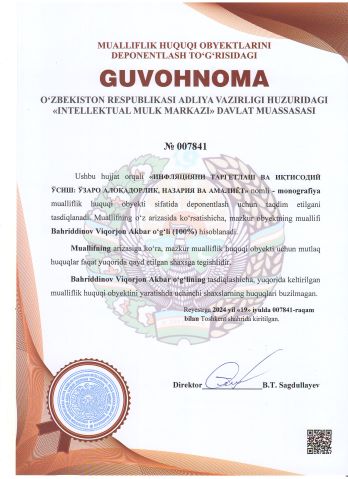 | 2263 | №007841 | Monografiya - "ИНФЛЯЦИЯНИ ТАРГЕТЛАШ ВА ИҚТИСОДИЙ ЎСИШ: ЎЗАРО АЛОҚАДОРЛИК, НАЗАРИЯ ВА АМАЛИЁТ" | Bahriddinov Viqorjon Akbar o‘g‘li (100%) | Bahriddinov Viqorjon Akbar o‘g‘li | 07/19/2024 | ![]() |