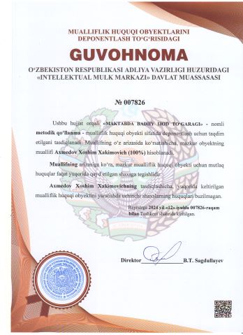 | 2278 | №007826 | Metodik qo‘llanma - "MAKTABDA BADIIY IJOD TO‘GARAGI" | Axmedov Xoshim Xakimovich (100%) | Axmedov Xoshim Xakimovich | 07/12/2024 | ![]() |