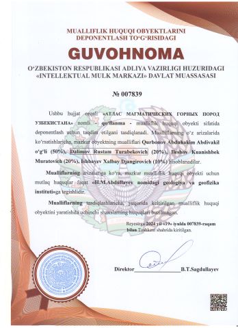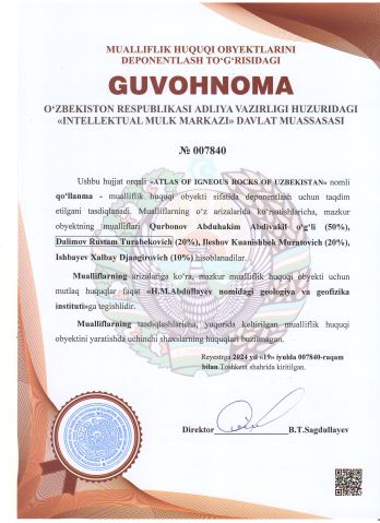 | 2264 | №007840 | Qo‘llanma - "ATLAS OF IGNEOUS ROCKS OF UZBEKISTAN" | Qurbonov Abduhakim Abdivakil o‘g‘li (50%), Dalimov Rustam Turabekovich (20%), Ileshov Kuanishbek Muratovich (20%), Ishbayev Xalbay Djangirovich (10%) | H.M.Abdullayev nomidagi geologiya va geofizika instituti | 07/19/2024 | ![]() |