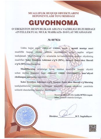 | 2280 | №007824 | Matnli musiqa asari - "MILLAT UMIDI" | Xolov Zoxidjon Ashirmat o‘g‘li (50%), Jurayev Zoxir shox Sherali o‘g‘li (50%) | "MILLAT UMIDI UNIVERSITY" mas’uliyati cheklangan jamiyati | 07/12/2024 | ![]() |