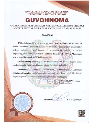 | 2298 | №007806 | Ishlanma - "ILM BILIM MA’RIFAT JUFT MINORALAR MAJMUASI" | Maxmudov Yuldash Rozakovich (50%), Munavarov Abrorxon Alimjanovich (50%) | Maxmudov Yuldash Rozakovich, Munavarov Abrorxon Alimjanovich | 07/03/2024 | ![]() |