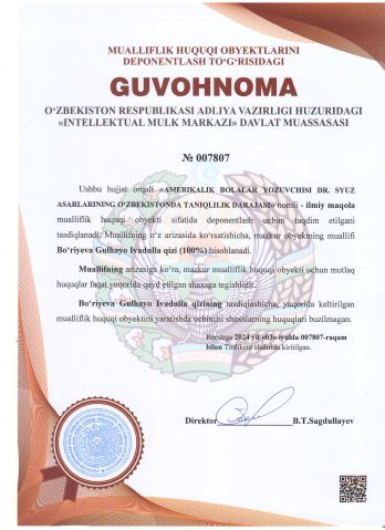 | 2297 | №007807 | Ilmiy maqola - "AMERIKALIK BOLALAR YOZUVCHISI DR. SYUZ ASARLARINING O‘ZBEKISTONDA TANIQLILIK DARAJASI" | Bo‘riyeva Gulhayo Ivadulla qizi (100%) | Bo‘riyeva Gulhayo Ivadulla qizi | 07/03/2024 | ![]() |