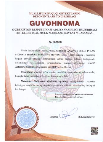| 2296 | №007808 | Ilmiy maqola - "ENHANCING CRITICAL ANALYSIS SKILLS IN LAW STUDENTS THROUGH DETECTIVE FICTION" | Xatamova Nodiraxon Qosimjon qizi (100%) | Xatamova Nodiraxon Qosimjon qizi | 07/03/2024 | ![]() |
