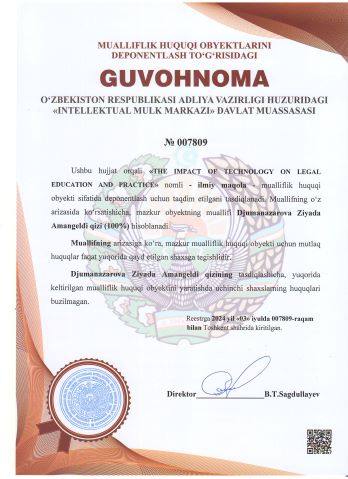| 2295 | №007809 | Ilmiy maqola - "THE IMPACT OF TECHNOLOGY ON LEGAL EDUCATION AND PRACTICE" | Djumanazarova Ziyada Amangeldi qizi (100%) | Djumanazarova Ziyada Amangeldi qizi | 07/03/2024 | ![]() |